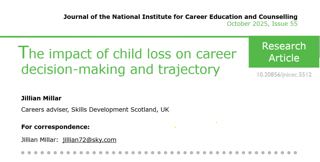 Huge congratulations to Jillian on getting her paper “The impact of child loss on career decision-making and trajectory” published by the Nice Journal. Jillian Millar mum to Rachael and Frazer is now a Careers adviser…